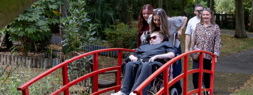 A person in a wheelchair being accompanied by several people across a red wooden bridge in a park setting with trees and greenery.